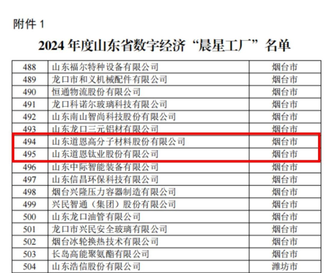 克日,,,,,,山东省工信厅宣布2024年度山东省数字经济“晨星工厂”名单,,,,,,PA旗舰厅·(中国)官方网站股份、PA旗舰厅·(中国)官方网站钛业公司双双名列其中。。。。。。。。